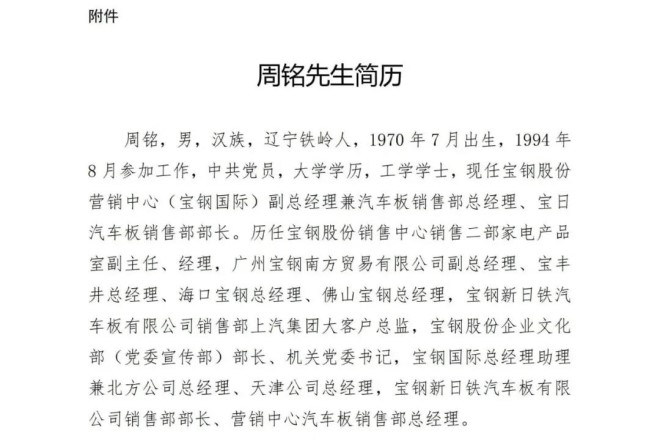近日,山東鋼鐵股份有限公司(以下簡稱山鋼股份)發布第七屆董事會第四次會議決議公告稱,聘任周銘先生為山鋼股份副總經理(掛職)。根據簡歷,周銘此前一直在寶鋼工作,現任寶鋼股份營銷中心(寶鋼國際)副總經理兼汽車板銷售部總經理、寶日汽車板銷售部部長。此舉被認為是中國寶武重組山鋼集團(詳見:重磅!中國寶武擬重組山鋼集團!)的又一實質性動作。