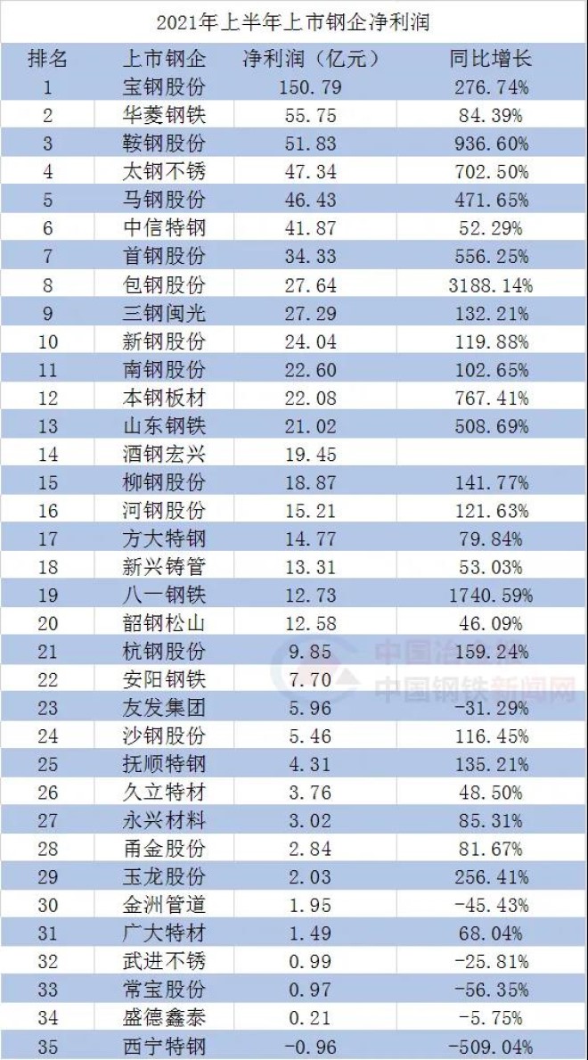 2021年上半年35家上市鋼企利潤排行榜出爐