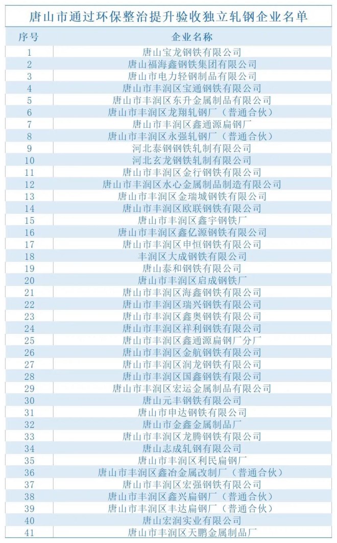 近日,按照《唐山市獨立軋鋼行業整治提升工作方案》,唐山市生態環境局組織鋼鐵行業專家對該市部分獨立軋鋼企業進行了現場驗收,并分批對通過驗收的企業名單予以公示。經中國冶金報社小編匯總,目前共有41家獨立軋鋼企業通過環保整治提升驗收。