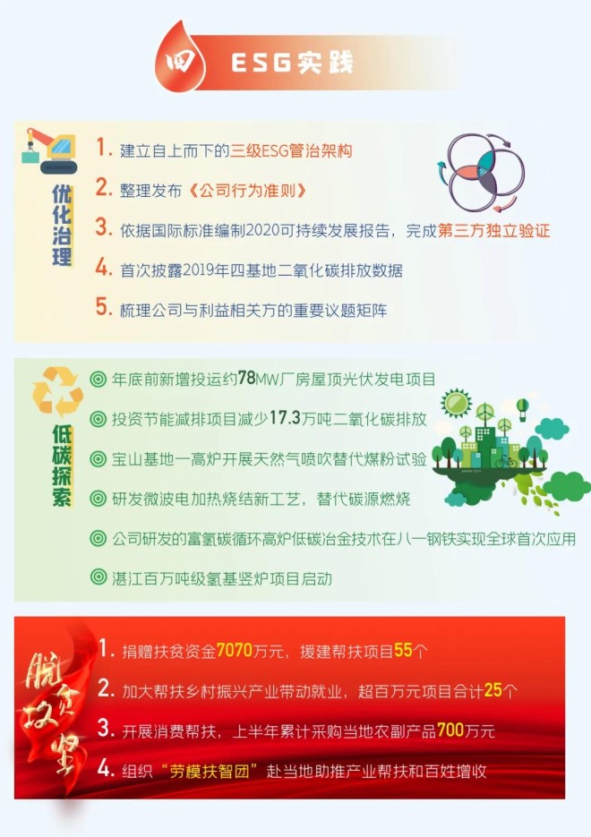 答:圍繞國家“碳達峰、碳中和”目標,當前國家、地區、各行業等各層面正在研究制定相關政策,中國寶武也已發布碳減排目標,即2023年力爭實現碳達峰,2035年力爭減碳30%,2050年力爭實現碳中和。公司積極響應國家雙碳戰略,成立了碳中和辦公室,統籌推進寶鋼股份綠色低碳領域的科技創新、技術合作、最佳實踐推廣及碳數據、碳資產管理等工作,目前正在逐步構建公司碳排放管理體系,研究編制碳達峰及降碳路線方案。公司已在以下方面進行了積極探索:八鋼富氫碳循環高爐實驗平臺的建設與實驗,八鋼歐冶爐煤氣CO2分離與再利用,湛江100萬噸氫還原豎爐的試驗工程,寶山高爐噴吹天然氣,微波燒結試驗工程,生物質的加工與燃料替代等。公司未來將通過以氫冶金、碳循環為代表的低碳制造,以智慧制造為代表的效率提升,以產品性能提升為代表的綠色產品使用等,積極踐行鋼鐵行業綠色低碳轉型,做行業的綠色低碳發展的引領者。