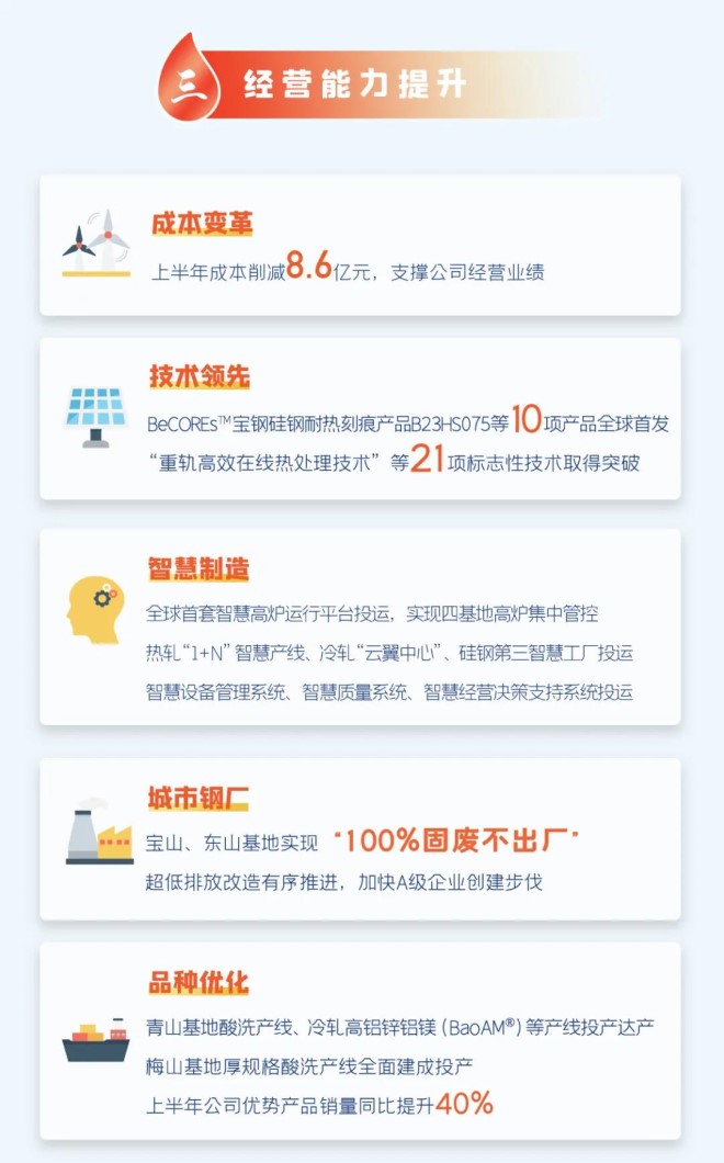 答:公司始終堅持精品發展戰略,產品聚焦于高技術含量、高附加值的碳鋼薄板、厚板與鋼管等精品,已形成了汽車用鋼、電工鋼、中高端長材、家電板、能源與重大工程用鋼、鍍錫板等全系列產品,公司自主研發的新一代汽車高強鋼、電工鋼、高等級家電用鋼、油氣管、橋梁用鋼、熱軋重軌等高端產品處于國際先進水平。公司持續關注中國高端制造業如軍工、核電、高鐵、海工裝備、新能源汽車等產業的高速增長,規劃了包括超高強鋼、取向硅鋼與高牌號無取向硅鋼等在內的高端產品研發與產線布局,并研發儲備更高端的新材料、新工藝技術,上半年實現了BeCOREsTM 寶鋼硅鋼耐熱刻痕產品B23HS075等10項產品全球首發。