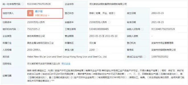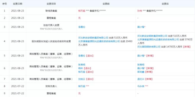 8月23日,據(jù)企查查信息顯示,河北新武安鋼鐵集團(tuán)烘熔鋼鐵有限公司工商信息完成一系列變更。