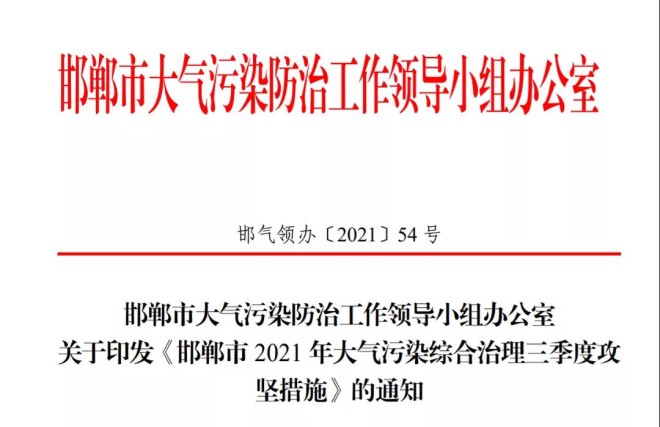 近日,邯鄲市大氣污染防治工作領導小組辦公室發布了關于邯鄲市2021年大氣污染綜合治理三季度攻堅措施的通知。
