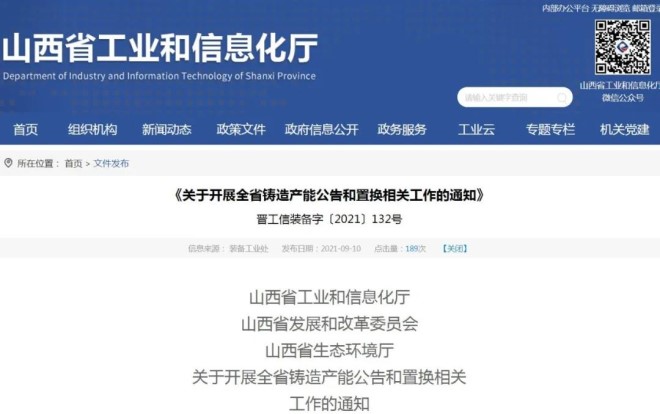 9月10日,山西省工業(yè)和信息化廳發(fā)布了《關(guān)于開展全省鑄造產(chǎn)能公告和置換相關(guān)工作的通知》,安排了山西省關(guān)于鑄造產(chǎn)能公告與產(chǎn)能置換項目的報送工作。