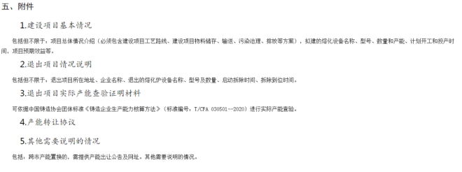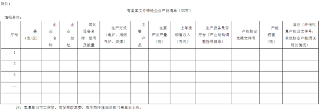 我省第一批鑄造產(chǎn)能公告后,即可按照《通知》要求開展產(chǎn)能置換項目報送工作。產(chǎn)能置換項目應(yīng)按照本通知附件4格式上報,文件一式四份(含匯總掃描電子版),報送省工業(yè)和信息化廳。