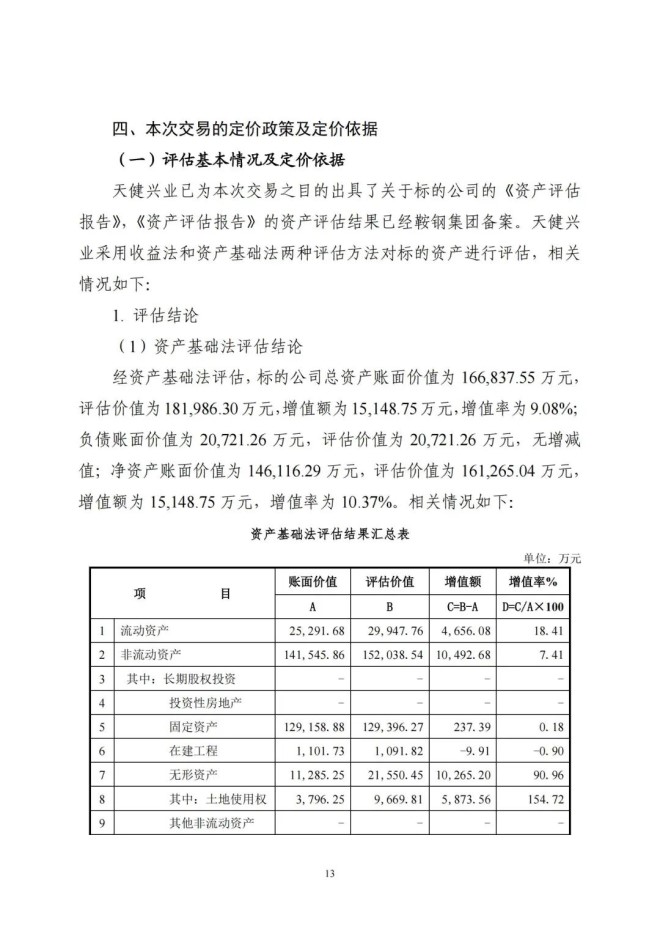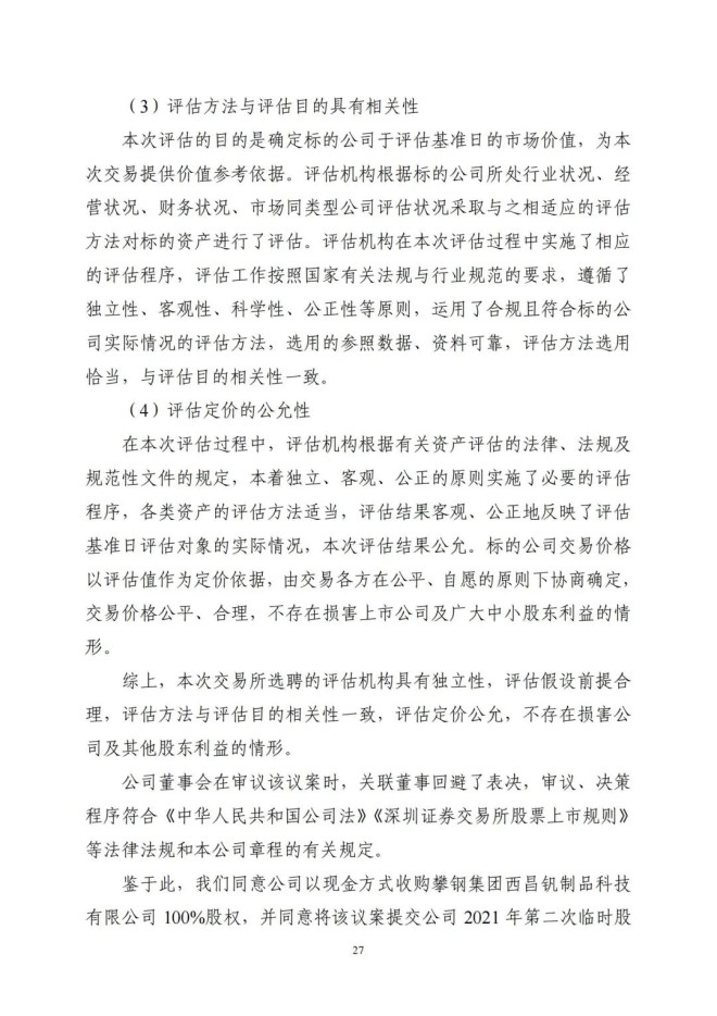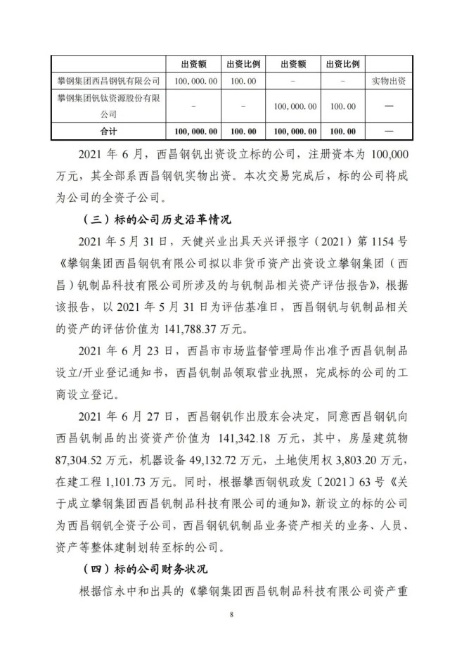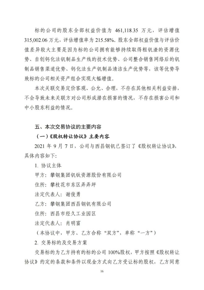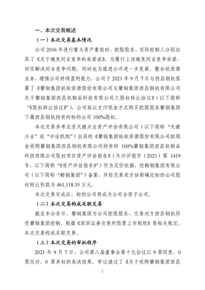 本次交易參考北京天健興業資產評估有限公司出具的《攀鋼集團釩鈦資源股份有限公司擬現金收購攀鋼集團西昌鋼釩有限公司持有的 100%攀鋼集團西昌釩制品科技有限公司股權項目資產評估報告》作為定價依據,經鞍鋼集團有限公司備案,并經交易雙方協商確定標的公司股權轉讓價款為 461118.35 萬元。
