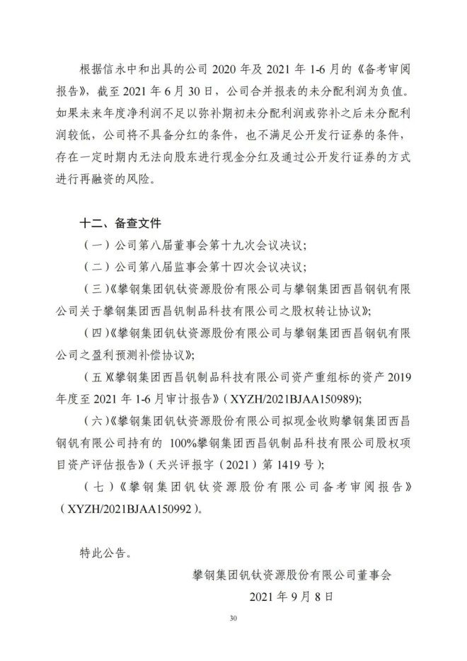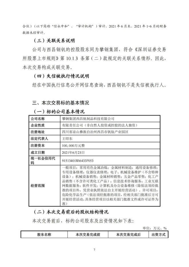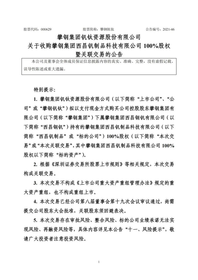 9月8日,攀鋼釩鈦發布了《關于收購攀鋼集團西昌釩制品科技有限公司100%股權暨關聯交易的公告》,該公司擬以支付現金方式,購買公司控股股東攀鋼集團有限公司下屬攀鋼集團西昌鋼釩有限公司持有的攀鋼集團西昌釩制品科技有限公司100%股權。