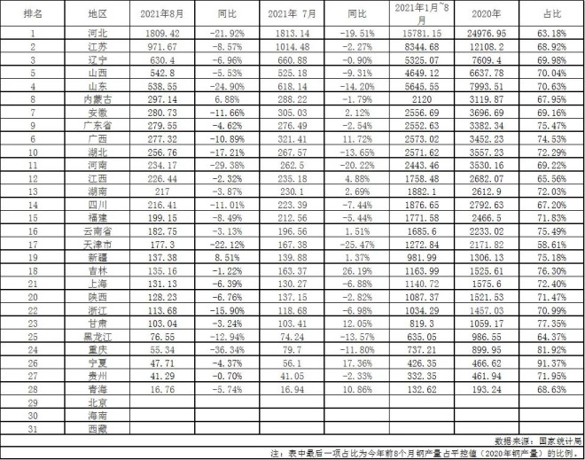 表1:2021年7月、8月份中國大陸各地粗鋼產量表(單位:萬噸)