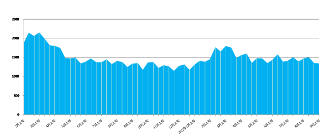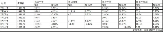 從鋼鐵企業庫存情況來看,今年7月份以來,鋼材庫存總體保持平穩、小幅波動態勢,但庫存水平總體高于去年同期。據鋼協統計,7月上旬,重點統計鋼鐵企業鋼材庫存量1405.73萬噸,比上一旬(即6月底)增加29.12萬噸,增長2.12%;比去年同期增加44.14萬噸,增長3.24%。8月下旬,重點統計鋼鐵企業鋼材庫存量為1342.71萬噸,比上一旬減少150.71萬噸,降低10.09%;比去年同期增加105.75萬噸,增長8.55%。到9月上旬,重點統計鋼鐵企業鋼材庫存量1332.38萬噸,比上一旬減少10.33萬噸,降低0.77%;比年初增加170.28萬噸,增長14.65%;比去年同期增加5.38萬噸,增長0.41%。