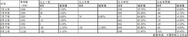 從社會庫存情況來看,7月份以來,鋼材社會庫存基本保持比較平穩態勢。據鋼協統計,7月上旬,20個城市5大品種鋼材社會庫存1166萬噸,環比增加37萬噸,上升3.3%,庫存繼續小幅回升;比年初增加436萬噸,上升59.7%;比去年同期減少82萬噸,下降6.6%。8月下旬,20個城市5大品種鋼材社會庫存為1174萬噸,環比減少18萬噸,下降1.5%;比年初增加444萬噸,上升60.8%;比去年同期減少61萬噸,下降4.9%。到9月上旬,20個城市5大品種鋼材社會庫存1138萬噸,環比減少 36萬噸,下降3.1%,庫存連續下降;比年初增加408萬噸,上升55.9%;比去年同期減少105萬噸,下降8.4%。