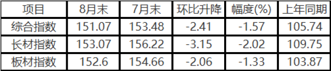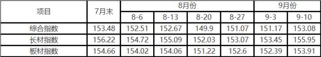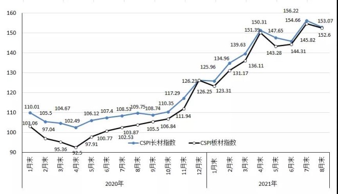 8月末,CSPI長材指數為153.07點,環比下降3.15點,降幅為2.02%。CSPI板材指數為152.60點,環比下降2.06點,降幅為1.33%;與上年同期相比,長材、板材指數分別上升43.32點和48.73點,升幅分別為39.47%和46.91%。(見下圖、表)