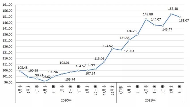 據中國鋼鐵工業協會(以下簡稱鋼協)監測,8月末,中國鋼材價格指數(CSPI)升至151.07點,比7月末下降2.41點,降幅為1.57%;與上年同期相比上升45.33點,升幅為42.87%。(見下圖)