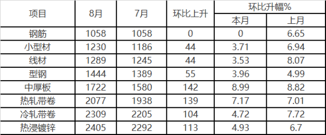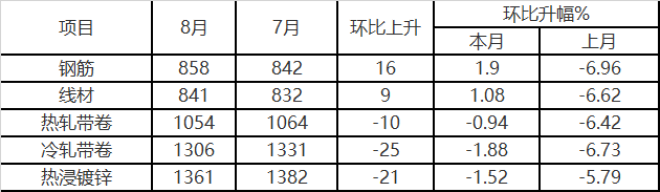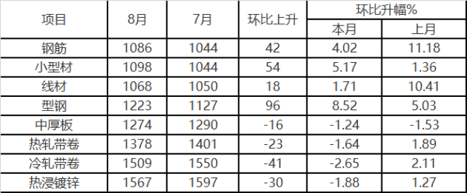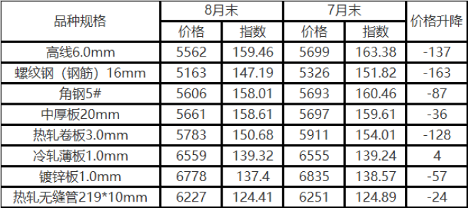 8月末,在鋼協監測的八大鋼材品種中,除冷軋薄板價格相對平穩外,其它品種均有所下降。其中,高線、螺紋鋼、熱軋卷板降幅較大,環比分別下降137元/噸、163元/噸和128元/噸;角鋼、中厚板、鍍鋅板和熱軋無縫管降幅相對較小,環比分別下降87元/噸、36元/噸、57元/噸和24元/噸。(見下表)