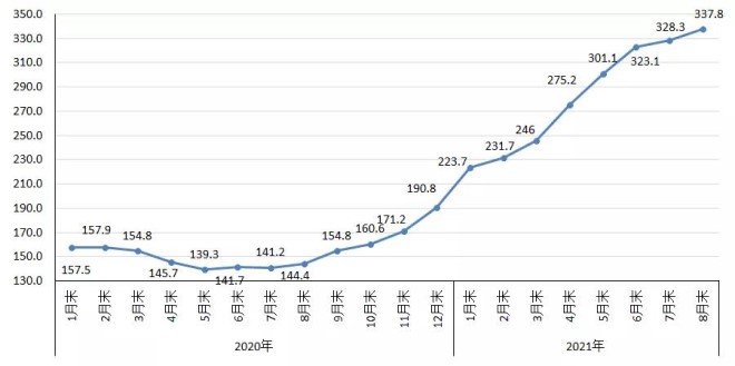 8月份,國際鋼材價格指數(CRU)為337.8點,環比上升9.5點,升幅為2.9%;與上年同期相比上升193.4點,升幅為133.9%。(見下圖、表)