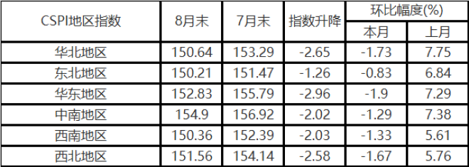 8月份,CSPI全國六大區域指數均由升轉降。其中:華北、東北、華東、中南、西南和西北地區環比降幅分別為1.73%、0.83%、1.90%、1.29%、1.33%和1.67%。(見下表)
