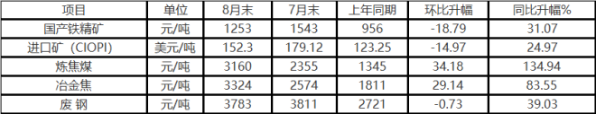 據鋼協監測,8月末,國產鐵精礦價格環比下降290元/噸,CIOPI進口礦價格環比下降26.82美元/噸,煉焦煤和冶金焦價格環比分別上升805元/噸和750元/噸,廢鋼價格環比下降28元/噸。從同比情況看,原燃材料價格仍處高位,其中國產鐵精礦和進口礦分別同比上漲31.07%和24.97%,煉焦煤和冶金焦價格分別同比上漲134.94%和83.55%,廢鋼價格同比上漲39.03%。雖然鐵礦石價格明顯下降,但煤焦價格大幅上漲,致使鋼材成本仍處于較高水平。(見下表)