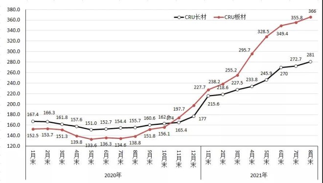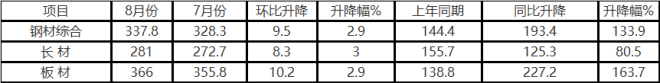 8月份,CRU長材指數為281.0點,環比上升8.3點,升幅為3.0%;CRU板材指數為366.0點,環比上升10.2點,升幅為2.9%,長材升幅比板材高0.1個百分點;與去年同期相比,CRU長材指數上升125.3點,升幅為80.5%;CRU板材指數上升227.2點,升幅為163.7%。(見下圖)