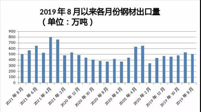 盡管8月份鋼材出口量比7月份減少了62萬(wàn)噸,環(huán)比下降了10.9%,但仍同比增長(zhǎng)了37.5%,數(shù)量也遠(yuǎn)高于2020年8月的368萬(wàn)噸,略高于2019年8月的501萬(wàn)噸。通過(guò)梳理近兩年來(lái)的各月份鋼材出口量(詳見(jiàn)下圖)也可以清楚地看到,今年8月份出口量總體仍處于比較高的水平。從累計(jì)數(shù)量來(lái)看,今年前8個(gè)月鋼材累計(jì)出口量遠(yuǎn)高于2020年同期的3656萬(wàn)噸,略高于2019年同期的4497萬(wàn)噸,也處于較高水平。同期,我國(guó)鋼材進(jìn)口徘徊在低位水平,整體呈現(xiàn)較大規(guī)模的凈出口。我國(guó)8月份凈出口鋼材399萬(wàn)噸,同比增加178%。1月~8月份累計(jì)凈出口鋼材3864萬(wàn)噸,同比增加1427萬(wàn)噸,略高于2019年同期的3733萬(wàn)噸。