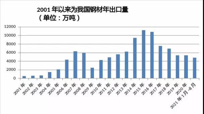 二是控制鋼材大量出口是實(shí)現(xiàn)“雙控”的需要。今年初以來(lái),由于海外鋼材市場(chǎng)價(jià)格明顯遠(yuǎn)高于國(guó)內(nèi),鋼鐵企業(yè)出口意愿一直很強(qiáng)勁。海關(guān)總署數(shù)據(jù)顯示,今年1月~7月份,我國(guó)分別出口鋼材524萬(wàn)噸、490萬(wàn)噸、754萬(wàn)噸、797萬(wàn)噸、527萬(wàn)噸、646萬(wàn)噸、567萬(wàn)噸,同比分別增長(zhǎng)20.0%、42.4%、16.5%、26.2%、19.8%、74.5%、35.8%。所以今年國(guó)家因此先后于4月底和7月底連續(xù)兩次調(diào)整鋼材出口退稅及關(guān)稅政策,來(lái)抑制鋼材的直接出口。特別是后一次調(diào)整后,國(guó)內(nèi)原來(lái)享有出口退稅的169個(gè)稅號(hào)鋼鐵產(chǎn)品出口退稅自8月1日起被全部取消,出口退稅率全部降為0,國(guó)內(nèi)鋼鐵產(chǎn)品出口不再享有出口退稅。國(guó)家對(duì)鋼材進(jìn)出口問(wèn)題政策導(dǎo)向已非常明確,在資源瓶頸和環(huán)境壓力雙重約束條件下,不鼓勵(lì)鋼材大量直接出口,以滿足內(nèi)需為主。為此,中國(guó)鋼鐵工業(yè)協(xié)會(huì)8月18日也發(fā)布了鋼鐵行業(yè)出口自律倡議書,呼吁鋼企要正確把握政策導(dǎo)向,加強(qiáng)出口自律,自覺(jué)控制出口總量,共同維護(hù)出口秩序。假若以后4個(gè)月保持8月份500萬(wàn)噸左右的鋼材出口量,今年鋼材出口量將超過(guò)6810萬(wàn)噸,遠(yuǎn)高于2020年的5367萬(wàn)噸(詳見(jiàn)下圖)。所以,后4個(gè)月鋼材出口必須同比大幅下降,才能確保全年鋼材出口量持平甚至下降,從而為順利實(shí)現(xiàn)“雙控”目標(biāo)保駕護(hù)航。