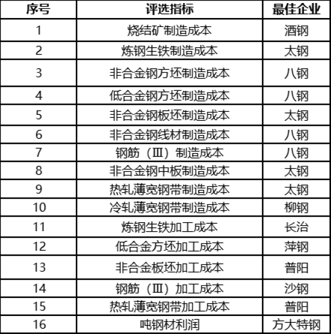 此次評(píng)選包括10項(xiàng)主要產(chǎn)品制造成本、5項(xiàng)加工成本和噸鋼材利潤(rùn)共16個(gè)指標(biāo)。其中,太鋼、八鋼分別占據(jù)4項(xiàng)指標(biāo),太鋼在煉鋼生鐵制造成本、非合金鋼板坯制造成本、非合金鋼中板制造成本、熱軋薄寬鋼帶制造成本4項(xiàng)指標(biāo)上為最佳企業(yè),八鋼在非合金鋼方坯制造成本、低合金鋼方坯制造成本、非合金鋼線材制造成本、鋼筋(Ⅲ)制造成本4項(xiàng)指標(biāo)上為最佳企業(yè);普陽(yáng)鋼鐵為占據(jù)2項(xiàng)指標(biāo)(非合金板坯加工成本、熱軋薄寬鋼帶加工成本)的最佳企業(yè);其余6家企業(yè)分別占據(jù)1項(xiàng)指標(biāo),酒鋼為燒結(jié)礦制造成本指標(biāo)最佳企業(yè),柳鋼為冷軋薄寬鋼帶制造成本指標(biāo)最佳企業(yè),首鋼長(zhǎng)鋼為煉鋼生鐵加工成本最佳企業(yè),沙鋼為鋼筋(Ⅲ)加工成本最佳企業(yè),萍鋼為低合金方坯加工成本指標(biāo)最佳企業(yè),方大特鋼為噸鋼材利潤(rùn)指標(biāo)最佳企業(yè)。