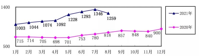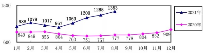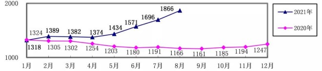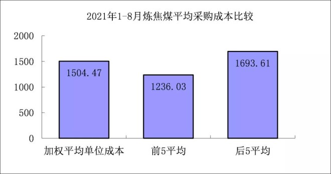 對標企業煉焦煤8月份加權平均折算成干基的采購成本為1865.88元/噸,環比升高170.35元/噸,升幅為10.05%。1-8月累計平均折算成干基的采購成本為1504.47元/噸,同比升高267.76元/噸,升幅為21.65%。