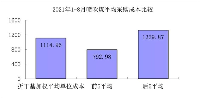 噴吹煤8月份加權平均折算成干基的采購成本為1353.36元/噸,環比升高88.60元/噸,升幅為7.00%。1-8月累計平均折算成干基的采購成本為1114.96元/噸,同比升高317.17元/噸,升幅為39.76%。