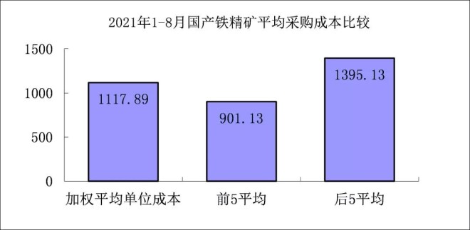 1-8月對標企業國產鐵精礦折算成62%品位的平均采購成本為1117.89元/噸,成本最低的前5家企業的加權平均采購成本為901.13元/噸,比對標企業平均采購成本低216.77元/噸,低于平均采購成本19.39%;而采購成本最高的5家企業的加權平均采購成本為1395.13元/噸,比對標企業平均采購成本高277.23元/噸,高于平均采購成本24.80%。