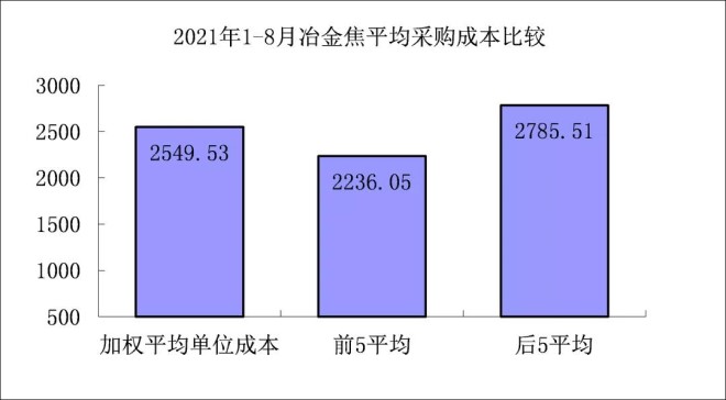 1-8月對標企業冶金焦平均采購成本最低的前5家企業的加權平均采購成本為2236.05元/噸,比對標企業平均采購成本低313.48元/噸,低于平均采購成本12.30%;而采購成本最高的5家企業的加權平均采購成本為2785.51元/噸,比對標企業平均采購成本高235.97元/噸,高于平均采購成本9.26%。