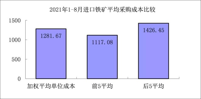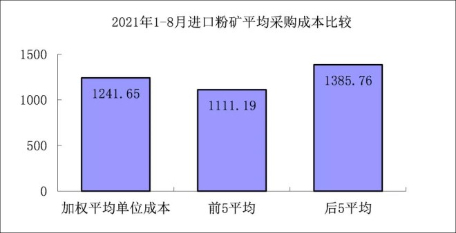 1-8月對標企業進口粉礦折算成62%品位的平均采購成本為1241.65元/噸,成本最低的前5家企業的加權平均采購成本為1111.19元/噸,比對標企業平均采購成本低130.46元/噸,低于平均采購成本10.51%;而采購成本最高的5家企業加權平均采購成本為1385.76元/噸,比對標企業平均采購成本高144.10元/噸,高于平均采購成本11.61%。