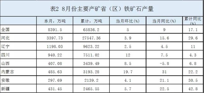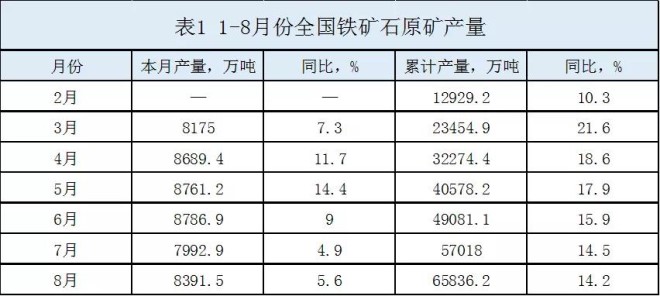 今年以來,我國鐵礦石產量明顯增長,月度產量始終保持較大幅度增長,累計產量始終保持兩位數增長(見表1)。據國家統計局數據,8月份全國鐵礦石原礦產量為8391.5萬噸,同比增長5.6%;1-8月份累計產量達6.58億噸,同比增長14.2%,年化產量將達到9.87億噸,2018年以來首次接近10億噸。