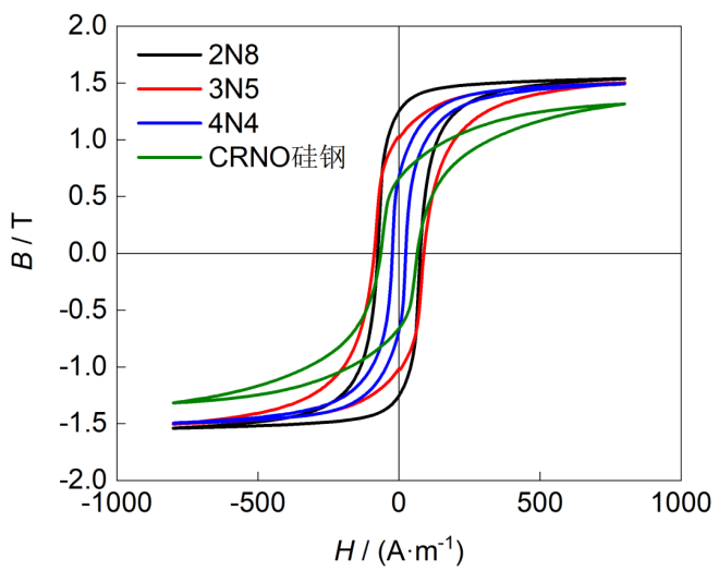 圖為CRNO硅鋼和不同純度純鐵的磁滯回線