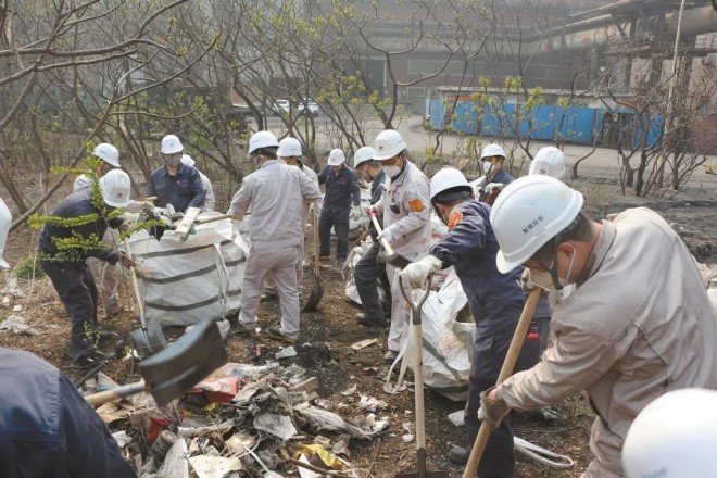 圖為2021年4月份,鞍鋼股份煉鋼總廠機關干部參加勞動,整治環(huán)境,建設美麗鋼廠。(鞍鋼供圖)