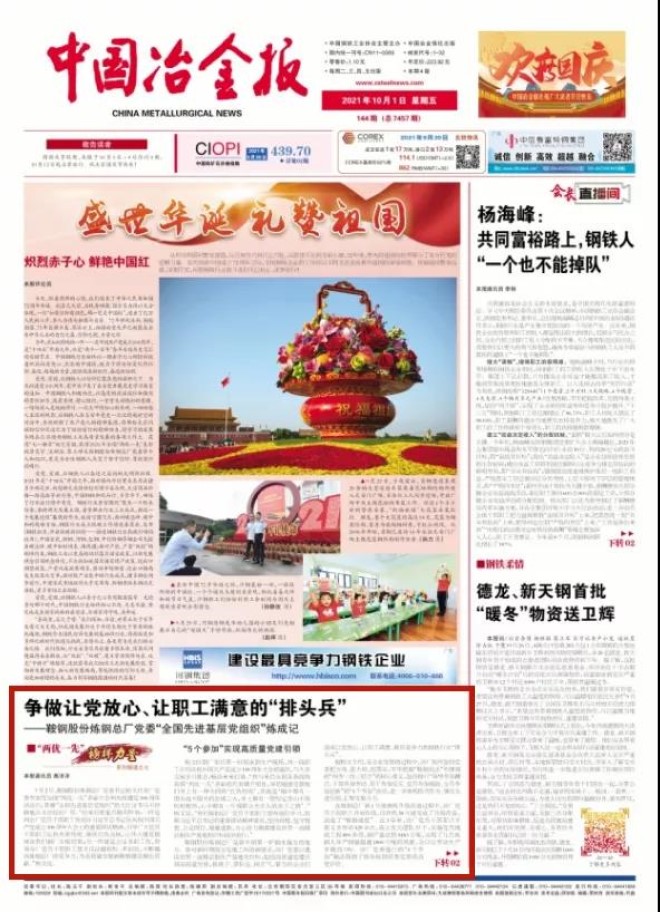 7月2日,鞍鋼股份煉鋼總廠黨委書記楊文代表廠黨委參加完全國“兩優(yōu)一先”表彰大會和慶祝建黨100周年活動后,帶著“全國先進基層黨組織”的大紅證書馬不停蹄地從北京趕回廠里?!盎貋砗笠攸c做兩件事:一件是向全廠黨員干部職工傳達好習近平總書記在慶祝中國共產(chǎn)黨成立100周年大會上的重要講話精神,引導廣大黨員干部職工弘揚光榮傳統(tǒng)、賡續(xù)紅色血脈,讓偉大建黨精神在我們鋼廠生根結(jié)果;另一件就是立足本職工作,帶領全廠黨員干部職工想方設法提指標、多創(chuàng)效,不斷提高煉鋼總廠的競爭力,為高質(zhì)量發(fā)展新鞍鋼建設做出貢獻?!睏钗恼f。