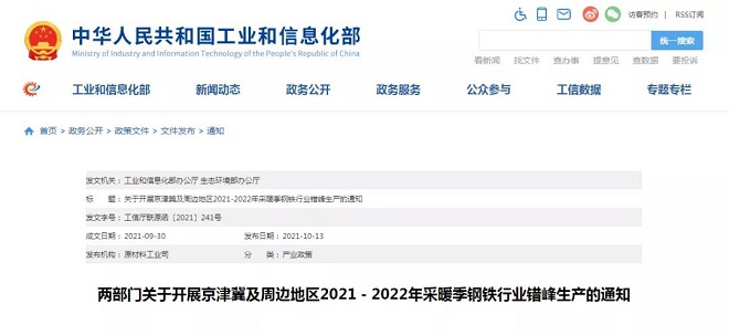 10月13日,工業和信息化部辦公廳、生態環境部辦公廳發布《關于開展京津冀及周邊地區2021-2022年采暖季鋼鐵行業錯峰生產的通知》,實施范圍包括北京、天津、河北、山東、山西等多個省市。