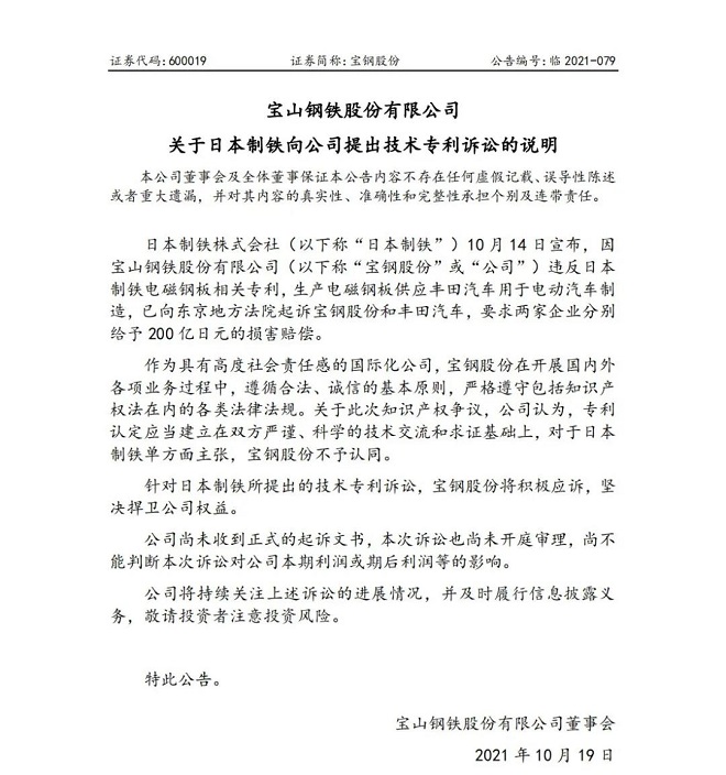 公告稱,日本制鐵株式會社(以下稱“日本制鐵”)10月14日宣布,因?qū)毶戒撹F股份有限公司(以下稱“寶鋼股份”或“公司”)違反日本制鐵電磁鋼板相關(guān)專利,生產(chǎn)電磁鋼板供應豐田汽車用于電動汽車制造,已向東京地方法院起訴寶鋼股份和豐田汽車,要求兩家企業(yè)分別給予200億日元的損害賠償。作為具有高度社會責任感的國際化公司,寶鋼股份在開展國內(nèi)外各項業(yè)務過程中,遵循合法、誠信的基本原則,嚴格遵守包括知識產(chǎn)權(quán)法在內(nèi)的各類法律法規(guī)。關(guān)于此次知識產(chǎn)權(quán)爭議,公司認為,專利認定應當建立在雙方嚴謹、科學的技術(shù)交流和求證基礎上,對于日本制鐵單方面主張,寶鋼股份不予認同。針對日本制鐵所提出的技術(shù)專利訴訟,寶鋼股份將積極應訴,堅決捍衛(wèi)公司權(quán)益。