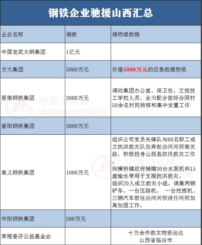 其中,多家鋼鐵企業已對此迅速展開馳援,據《中國冶金報》、中國鋼鐵新聞網小編不完全統計,鋼企對山西汛情的捐款總金額已超過2億元。
