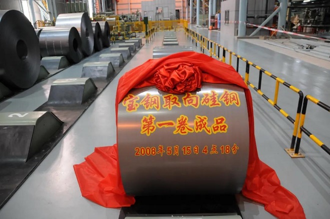 2008年5月15日,寶鋼取向硅鋼第一卷合格卷成功下線,標志著寶鋼取向硅鋼自主研發取得成功。僅僅相隔兩個半月,2008年7月29日,寶鋼第一卷高磁感取向硅鋼下線;又隔4個半月,2008年12月12日,寶鋼第一卷激光刻痕取向硅鋼下線。一年內,寶鋼取向硅鋼3個細分品種全部成功下線。