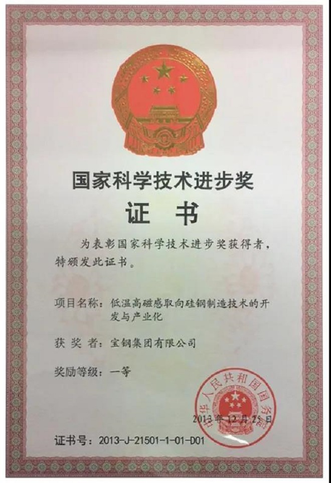 寶鋼取向硅鋼的成功開發和應用,得到了國家的高度肯定。2012年3月份,中國金屬學會與中國鋼鐵工業協會經過鑒定一致認為寶鋼取向硅鋼技術是中國鋼鐵行業完成的一項重大創新,技術水平達到國際一流。2013年,寶鋼低溫取向硅鋼開發與產業化項目,獲得國家科技進步獎一等獎。