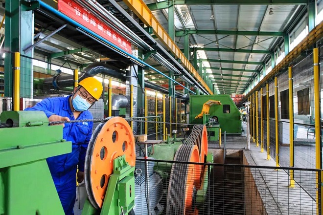圖為張宣高科金屬制品公司職工正在查看鋼絞線產(chǎn)品質(zhì)量。
