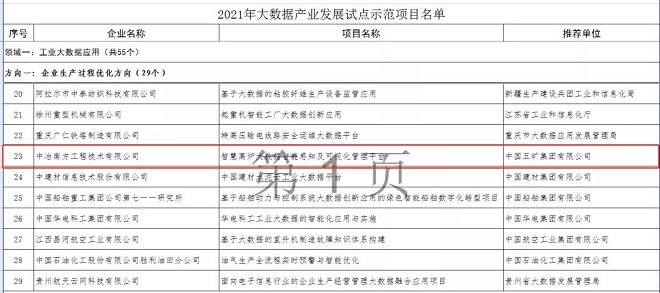 近日,工業與信息化部公布2021年大數據產業發展試點示范項目名單,由中冶南方申報、五礦集團推薦的智慧高爐大數據智能感知及可視化管理平臺項目成功入選。