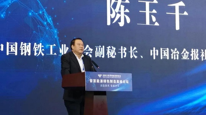 圖為中國鋼鐵工業協會副秘書長,中國冶金報社黨委書記、社長陳玉千為智慧能源綠色制造高峰論壇“雙碳”目標驅動冶金行業高質量發展分論壇致辭