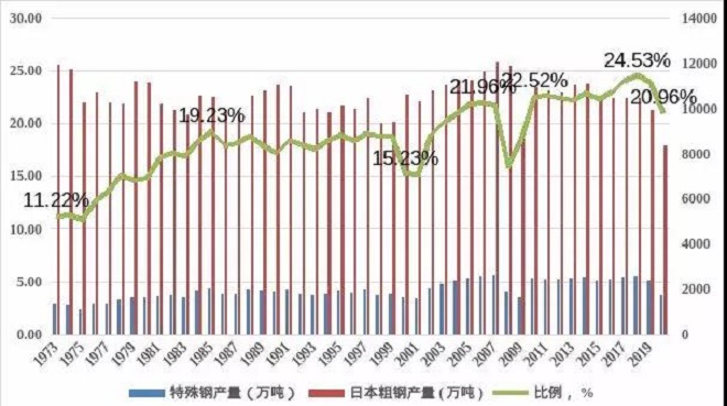 在日本粗鋼總產量保持穩定情況下,隨著經濟發展其特殊鋼產量不斷增加,從1973年的1338萬噸增長到了2018年最高值2559.4萬噸,占粗鋼比例也從1973年的11.22%增長到2018年的最高值24.53%。2020年受疫情影響,特殊鋼產量降為1743.6萬噸,占粗鋼比例下降為20.96%(詳見表2)。