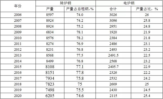 表1 日本歷年轉爐鋼和電爐鋼產量情況(萬噸)