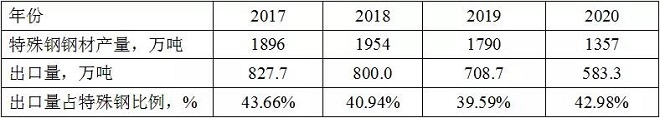 日本是一個特殊鋼材出口大國,特殊鋼鋼材以高質量聞名世界,比如高精度模具鋼,出口量不斷增加,從1980年的160萬噸增加到了2008年的590.9萬噸,2017年出口量達到了827.7萬噸,出口量占特殊鋼鋼材達到了44%。近兩年日本特殊鋼鋼材有所下降,2019年日本特殊鋼材出口量708.7萬噸,占特殊鋼材總產量39.59%,2020年受疫情影響特殊鋼材出口量為583.3萬噸,占特殊鋼鋼材總產量43%(詳見表3)。