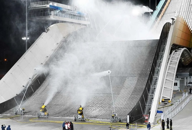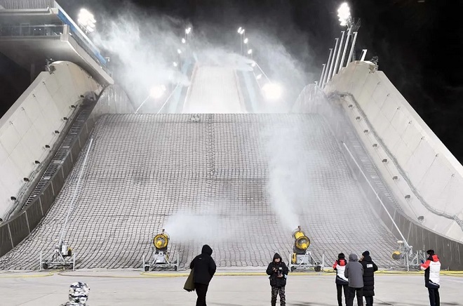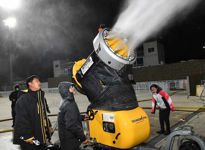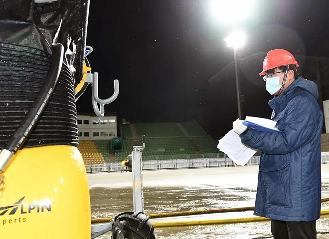 首鋼滑雪大跳臺位于北京首鋼園內,是北京冬奧會北京賽區(qū)新建的也是唯一的雪上項目競賽場館,將舉辦北京冬奧會單板滑雪大跳臺和自由式滑雪大跳臺項目比賽,誕生4塊金牌。大跳臺造雪工作預計到1月20日左右結束,具體視天氣情況而定。主要包括賽道本體造雪、儲雪區(qū)存雪、配合二次塑形團隊補雪三個階段,其中賽道本體造雪量近8000立方米,將于12月31日前完成并移交至二次塑形團隊塑形,同時山地運行團隊將按要求、按計劃于1月10日前進行3600立方米儲雪區(qū)存雪的造雪任務,20日前根據二次塑形團隊專家要求配合完成補雪工作。本次造雪,首鋼滑雪大跳臺場館運行團隊場館和基礎設施業(yè)務領域山地運行團隊為應對北京城區(qū)降溫晚、寒潮時間短等特點,特地在原有的7臺雪槍基礎上,增加了4臺雪炮。今天的造雪中,山地運行團隊在賽道本體起跳區(qū)設置了4臺雪槍2臺雪炮,結束區(qū)設置2臺雪槍2臺雪炮,1臺雪槍作為備用。
