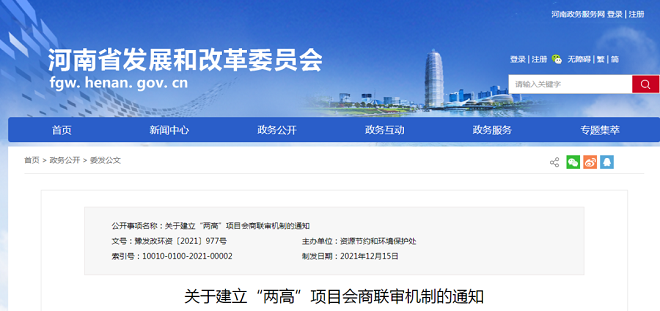《通知》中表示,為貫徹黨中央、國務院堅決遏制“兩高”項目盲目發展的要求,落實《河南省堅決遏制“兩高”項目盲目發展行動方案》,規范“兩高”項目論證程序,嚴格新建項目準入,經河南省政府同意,河南省發展改革委會同河南省工業和信息化廳、河南省自然資源廳、河南省生態環境廳建立“兩高”項目會商聯審機制。