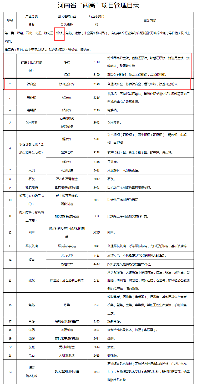 河南省參照外省經驗做法,結合河南省實際,建立了河南省“兩高”項目管理目錄。其中包括兩類:一是煤電、石化、化工、煤化工、鋼鐵、焦化、建材(非金屬礦物制品)、有色等8個行業年綜合能耗(等價值)5萬噸標準煤及以上的項目;二是8個行業中22個細分行業高耗能高排放環節年綜合能耗(等價值)1-5萬噸標準煤的項目,主要包括鋼鐵(長流程鋼鐵)、鐵合金、氧化鋁、電解鋁、鋁用碳素、銅鉛鋅硅冶煉(含原生和再生冶煉)、水泥、石灰、陶瓷、磚瓦(有燒結工序的)、耐火材料(有燒結工序的)、剛玉、平板玻璃、煤電、煉化、焦化(含蘭炭)、甲醇、氮肥、醋酸、氯堿、電石、瀝青防水材料等。其中,“十四五”新建“兩高”項目按新增能耗量計算,改建、擴建“兩高”項目(不含不涉及主體工程、未增加產能的技術改造項目)能耗量按改擴建后的年設計綜合能耗計算。