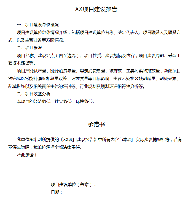 (四)企業編制擬建“兩高”項目建設報告。報告內容主要包括:項目建設內容、投資規模、建設期限、產能及產量、項目初步選址、年綜合能源消費量、煤炭消費量、污染物排放量及區域削減替代方案、碳排放量等內容。企業“兩高”項目建設報告(式樣見附件2)呈報縣(市、區)發展改革部門。