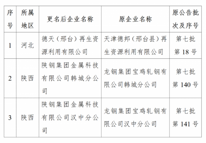 變更《廢鋼鐵加工行業(yè)準入條件》公告名稱的企業(yè)名單