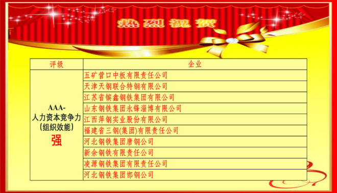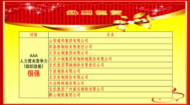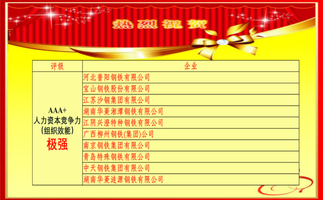 2021年鋼鐵行業共有100家鋼鐵企業(單鋼口徑)參加了鋼鐵行業人力資本競爭力(組織效能)指數評估。最終選取前30家分為三個評估等級進行發布:人力資本競爭力極強 (AAA+) 為普陽鋼鐵、寶鋼股份、沙鋼集團、華菱湘鋼、興澄特鋼、柳鋼集團、南京鋼鐵、青島特鋼、中天鋼鐵、華菱漣鋼十家企業;人力資本競爭力很強 (AAA)為山西建邦、陽春新鋼鐵、永鋼集團、沙鋼淮鋼、寶武鄂鋼、寧波鋼鐵、首鋼股份、大冶特鋼、寶武韶鋼、鞍山鋼鐵十家企業;人力資本競爭力強(AAA-)包括五礦營口中板、天津天鋼聯合特鋼、鑌鑫鋼鐵、山鋼永鋒淄博、江西萍鋼、福建三鋼、河鋼唐鋼、新余鋼鐵、凌源鋼鐵、河鋼邯鄲十家企業。